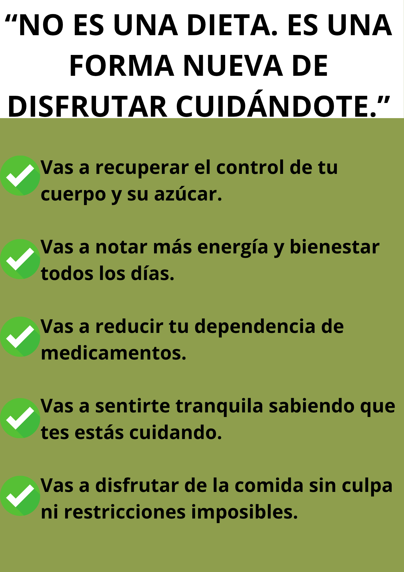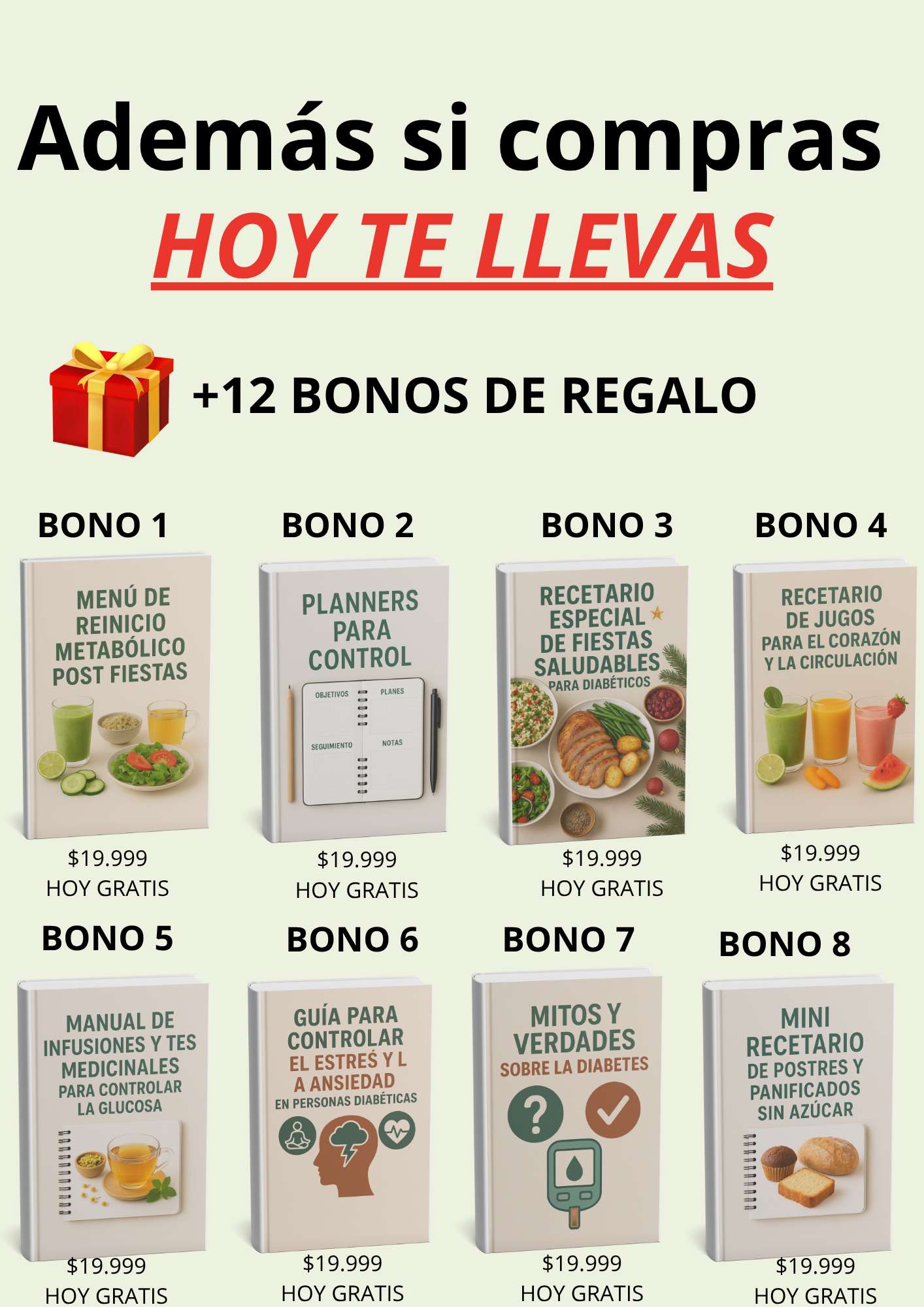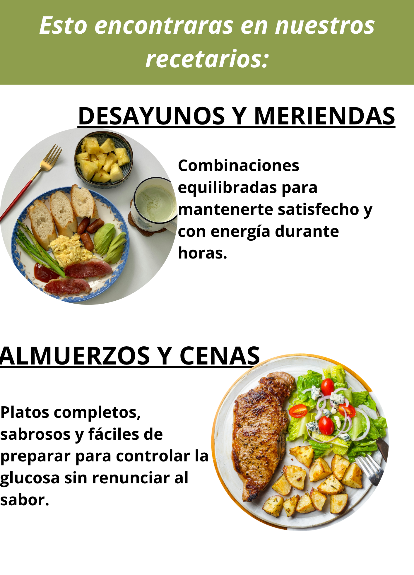 Incluye un plan completo de 29 días con desayunos, almuerzos, cenas, snacks y meriendas, más 14 bonos adicionales que te ayudan a organizar tus comidas, entender mejor tus niveles de glucosa y mejorar tu salud día a día.