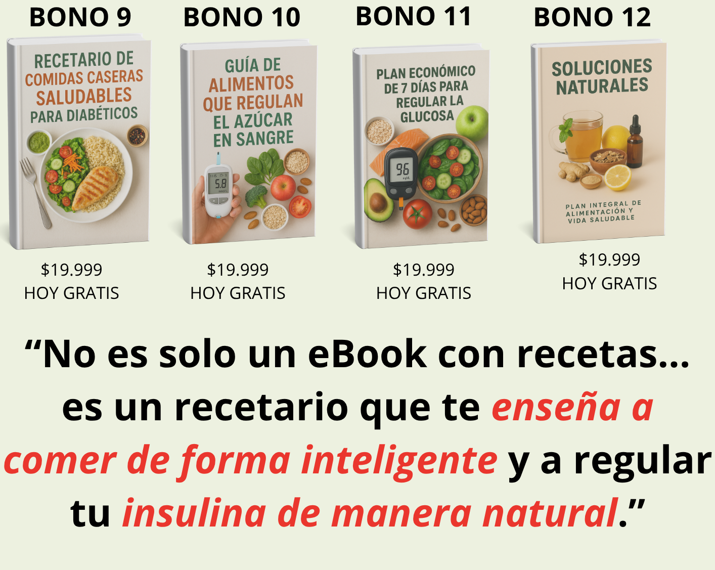 Incluye un plan completo de 29 días con desayunos, almuerzos, cenas, snacks y meriendas, más 14 bonos adicionales que te ayudan a organizar tus comidas, entender mejor tus niveles de glucosa y mejorar tu salud día a día.